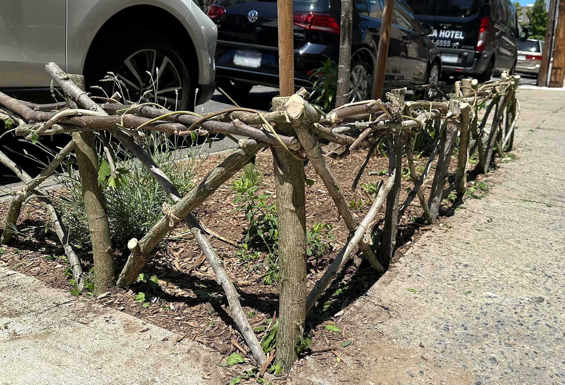 Sidewalk Gardens present a unique opportunity to garden in the public right-of-way. Difficult conditions (shade, foot traffic, etc.) call for tough plants and protective fencing. Woven wood fences made from reclaimed pruning materials are featured below.